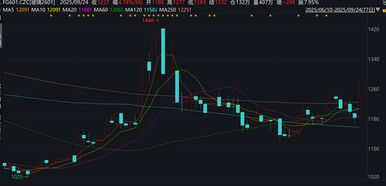 行情导读:今日玻璃相关合约大幅上涨,其中主力2601合约盘中最大涨幅超6%,最终收于1237点.涨幅4.74%。